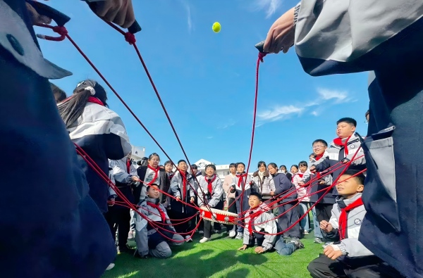 活动现场,三个趣味项目依次展开:在“幸福的传递”环节,学生们以小组为单位,用气球夹着纸杯接力传递,指尖的轻触、眼神的默契,让“信任”在欢声笑语中流转。“车轮滚滚”项目里,大家合力撑起“履带”稳步前进,步伐的同步、彼此的鼓劲,让“协作”成为脚下最稳的支撑。而“击鼓颠球”时,数十根红绳牵动一面鼓,在一次次调整节奏、共同颠起网球的过程中,“包容”与“默契”成了最生动的注脚。