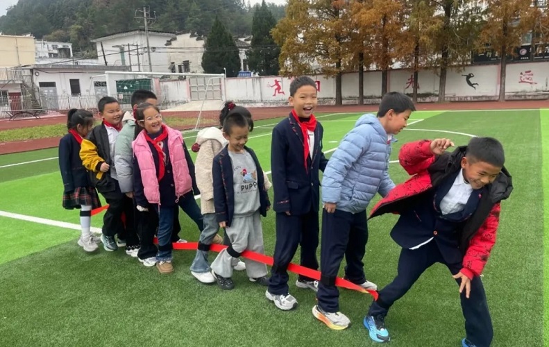第一个游戏“小马过河”迅速点燃了全场气氛。同学们需要依次站上“石块”,穿过场地中的“河流”,安全抵达终点。游戏中,孩子们团结一致,配合默契,保持着专注的神情,“石块”在手中快速传递着,笑声朗朗。随后进行的“神笔马良”游戏,则将团队协作考验推向高潮。各小组需共同牵引一根系有多根绳子的巨笔,在纸上写下同一个字。看似简单的任务,操作起来却困难重重,一笔一画都需要全组队员的默契配合与不断调整。最后的“巨人脚步”游戏,要求全组成员齐绑在一根带子上,如同一个“巨人”般齐步前进。口号是否统一、步伐是否一致,直接决定了“巨人”能否顺利行走。“一二一!一二一!”在响亮的口令声中,同学们相互搀扶,彼此鼓励,从最初的步履蹒跚到后来的健步如飞。